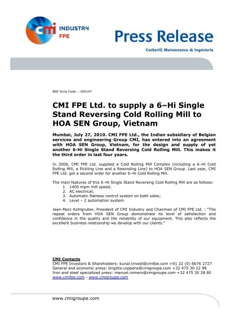 Cmi Fpe Ltd To Supply A 6 Hi Single Stand Reversing Cold Rolling