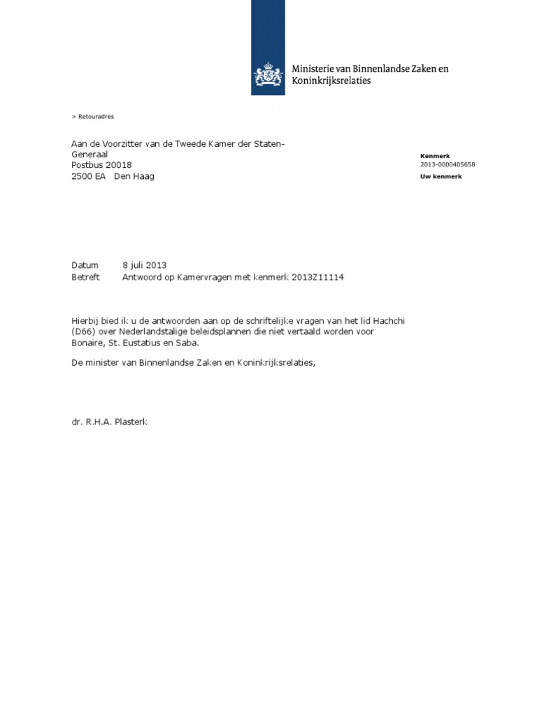 Beantwoording Kamervragen Over Nederlandstalige Beleidsplannen Die Niet Vertaald Worden Voor Bonaire St Eustatius En Saba